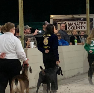 I showed my Nubian Doeling, Maleficent, at the 2019 Manatee County Fair goat show. We competed in the show and showmanship classes, and received blue ribbons in both. Maleficent placed third in her breed class. This was out second show together, and we both did really well. Maleficent stayed calm even though our senior showmanship class was very lengthy.